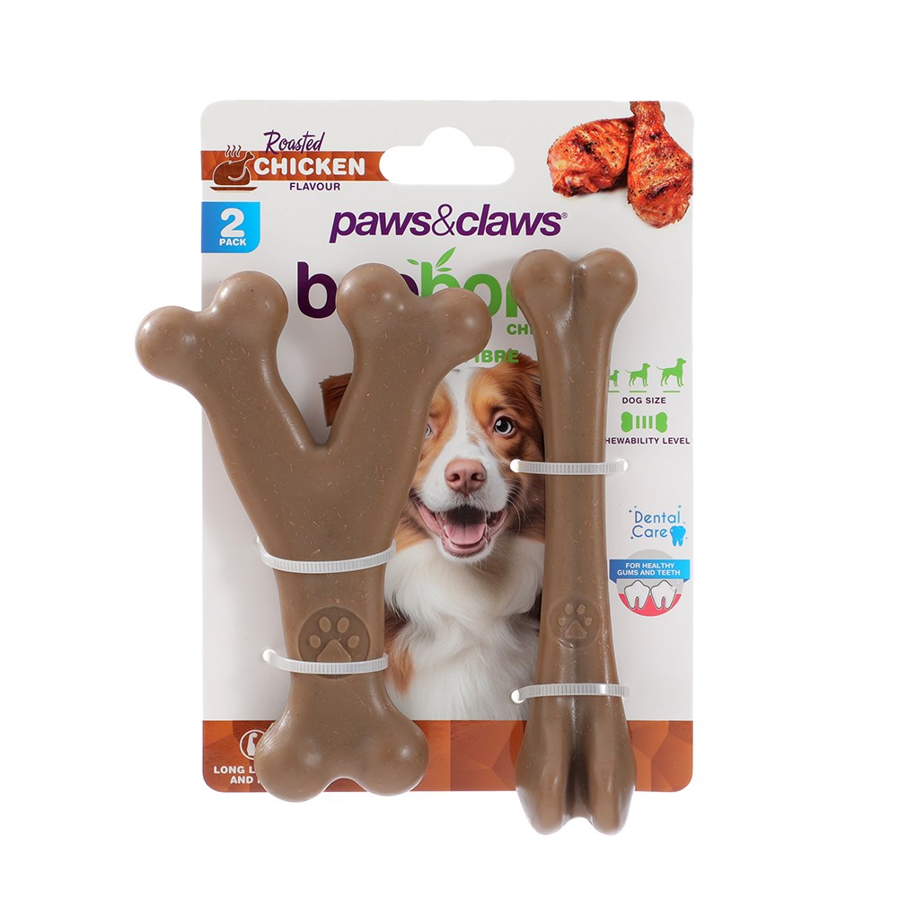 Give your furry friends something to drool over... Built to satisfy your dogs instinct to chew, our innovative Paws & Claws boobone Wishbone is designed to be tough with the strength of natural, sustainable, and renewable bamboo fibre. Our long lasting and durable chew toy has a real wood texture and comes in two delicious flavours your furry friends will love. Enjoy the multiple benefits of our boobones as they discourage destructive chewing, help to clean teeth, exercise jaw muscles, and are flavoured with non-animal ingredients.